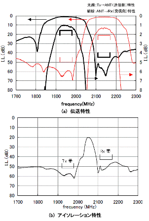 第二個例子,以圖2的BAND1(2GHz)收發(fā)雙工器(產(chǎn)品尺寸3.0×2.5×1.1mm)的特性為例。將特殊的設(shè)計技術(shù)引入到表面波難以實(shí)現(xiàn)低損耗的BAND1(2GHz)中來,在得到實(shí)際使用所需的隔離度的同時,還能實(shí)現(xiàn)Tx損耗1.4dB 和Rx損耗1.8dB這樣杰出的低損耗特性。一直以來,介質(zhì)收發(fā)雙工器在BAND1(2GHz)頻帶曾一度占據(jù)了主流的地位,而目前表面波做到了不亞于它的損耗值。由此,表面波收發(fā)雙工器替代了介質(zhì)收發(fā)雙工器成為了當(dāng)今主流。
