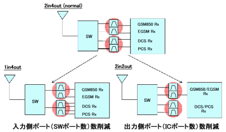 在手機(jī)的高頻率無線通信電路中使用的表面波濾波器,分為CDMA收發(fā)用的級間濾波器和GSM用的TOP濾波器等。村田的濾波器不僅具有低損耗和高抑制度的電特性,還由小型、薄型的各種產(chǎn)品尺寸構(gòu)成了豐富的商品線,可以對應(yīng)各種電路設(shè)計的需求。例如, 在多頻段發(fā)展的高頻無線通信電路中,為了減小電路基板上的貼裝面積,將兩個頻帶的單濾波器(產(chǎn)品尺寸1.35×1.05×0.5mm)合二為一,制造出了雙濾波器(產(chǎn)品尺寸1.8×1.35×0.5mm)。此外還運(yùn)用特殊的技術(shù)制造許多獨(dú)特的商品,如將雙層濾波器的輸入端合并為一個的1in4out產(chǎn)品,以及將平衡器的輸出端合并為一的2in2out產(chǎn)品等。通過共用輸入端可以節(jié)省原本用于分頻的開關(guān)(SW)。同時,共用平衡輸出端可以使連接濾波器的高頻IC的端口數(shù)目減少(圖3)。這是在表面波濾波器的設(shè)計中通過調(diào)整阻抗和相位等方法,從而使差分端口實(shí)現(xiàn)共用。這些濾波器可以在多頻帶化發(fā)展的高頻無線電路中,為外圍電路的簡化及電路整體的小型化做出貢獻(xiàn)。今后村田制作所將繼續(xù)致力于研發(fā)更小型化和高性能化,同時又具有輸入端以及輸出端共用功能的單濾波器、雙濾波器產(chǎn)品。