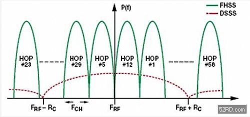 除了FHSS,直接展頻(DSSS)也被新的歐洲法令所納入,在DSSS系統中,窄帶的信號被乘上一高速虛擬亂數(PRN)序列,以產生出展頻信號。每一個PRN脈沖稱為一個"chip",而序列的速率則是叫作"chiprate"。至于原始窄帶信號所能展開的程度,則是稱之為處理增益(processinggain),此為chiprate(RC)對窄帶資料符號率(narrowbanddatasymbolrate)的比值。圖二所示為FHSS與DSSS的比較。