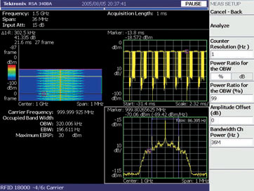 政府規(guī)定要求控制發(fā)射信號的功率、頻率、帶寬。這些規(guī)定防止有害干擾并保證每個發(fā)射者都是頻帶內(nèi)其他用戶的友好鄰居。對于許多頻譜分析儀特別是通常用于脈沖信號能量測量的掃頻頻譜分析儀,進(jìn)行此類測量是具有挑戰(zhàn)性的。RTSA 能夠分析一個完整的分組發(fā)射過程的能量特點(diǎn),也能直接測量跳頻信號的載波頻率,而無需將信號置于一個跨度的中心。按一下按鍵,分析儀就能識別一個瞬時 RFID 信號的調(diào)制方式并能夠?qū)β?、頻率和帶寬進(jìn)行監(jiān)管測量,使預(yù)一致性(pre-compliance)測試過程變得非常靈活和方便 [參閱圖2]。預(yù)一致性測試有助于確保產(chǎn)品一次通過一致性測試,而無需重新設(shè)計(jì)和重新測試。