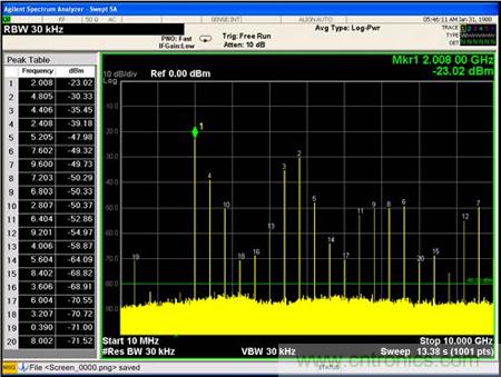 測試1:單輸入信號的中頻信號輸出頻譜測試