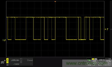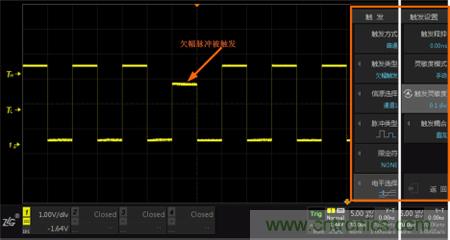 如下圖所示,設置了欠幅觸發及普通觸發后,欠幅脈沖信號被觸發,穩定的顯示在屏幕上。