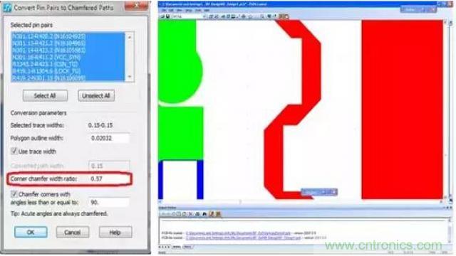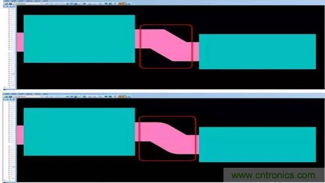 射頻和微波電路中經常用到倒角,以減小饋線與電容器之間的分段不連續(xù)性電抗,從而改善MMIC 的頻率性能。90º 拐角與倒角之間的距離至關重要。因此,設計人員需要采用自動方法來基于設計指定需要生成的倒角比率。PCB 設計工具如果能夠基于設計規(guī)則自動強制實施需要生成的倒角比率,設計人員和工程師將會從中受益,在節(jié)省時間的同時提高設計質量(圖3)。