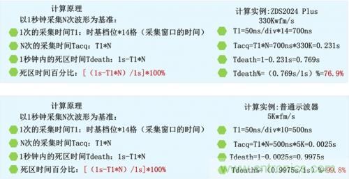 死區時間(處理時間):是示波器對采樣存儲回來的數字信號進行測量運算,顯示等處理的過程。死區時間內示波器不進行采集。