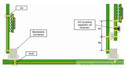 連接器④背板PCB走線⑤對(duì)側(cè)子卡連接器⑥對(duì)側(cè)子卡PCB走線⑦AC耦合電容⑧接收端芯片(封裝與PCB過孔)