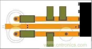 每個這些通孔都會在內接地層上產生大于通孔直徑自身的禁入區,提供制造空隙。這些禁入區很容易在回流路徑上造成中斷。一些通孔彼此靠近則會形成接地層溝,頂層CAD視圖看不見,這將導致情況進一步復雜化。圖2兩個電源層通孔的接地層空隙可產生重疊的禁入區,并在返回路徑上造成中斷?;亓髦荒苻D道繞過接地層禁入區,形成現在常見的發射感應路徑問題。