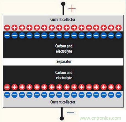 圖2是EDLC電容的橫截面圖。從圖中可以看到兩個(gè)由電解液包圍著的納米顆粒活性碳層,電解液中間則有一個(gè)“隔離”層。這兩個(gè)碳層與集電極相接觸,并由集電極將電流輸送到外部。這兩個(gè)碳層由兩個(gè)串聯(lián)電容組成,因此命名為雙層電容或DLC。由于電容內(nèi)的電荷載體實(shí)際上處于離子態(tài),因此使用了術(shù)語電化學(xué)DLC(或EDLC)。這張圖也顯示了簡(jiǎn)單的原理,其中電荷主要集中在集電極-碳接口。電容(C)直接正比于有效面積(A),并反比于這些電荷(或C a A/d)之間的隔離距離(d)。雙層電容的正負(fù)電荷之間的間距在納米范圍,這正是EDLC電容容量如此大的原因(因?yàn)檫@個(gè)間距要比靜電電容的電荷間距小好幾個(gè)數(shù)量級(jí))。