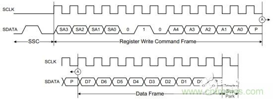 RFFE定義了很多種類的命令序列,來對總線上的設備進行讀/寫操作。每一條命令都包含:開始序列(SSC),命令序列(Command Frame)和數據序列Data Frame,如圖2為寄存器寫指令的時序。