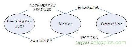 TAU周期請求定時器(T3412)由網絡側在ATTCH和TAU消息中指定,3GPP協議規定默認為54min,最大可達310H。那么UE處理完數據之后,什么時候進入PSM模式呢?這是由另一個定時器Activer Timer(T3324,0-255秒)決定的。UE處理完成數據之后,RRC連接會被釋放、進入空閑態,與此同時啟動Active Timer,此Timer超時后,UE即進入上述PSM模式。轉換狀態如下(借圖):