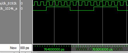 根據所需的時鐘頻率為256kHz的時鐘,而晶振時鐘的頻率為8192kHz,晶振時鐘與所需的時鐘頻率恰巧是32倍的整數倍關系,因此需要對8192kHz的晶振時鐘進行32分頻來獲得所需要的時鐘。根據整數倍分頻器的設計方法原理,通過ISE9.1邏輯設計工具,利用VHDL硬件描述語言來進行32分頻的分頻器設計。然而32又是偶數,所以需要設計的是偶數分頻器。對設計的內容通過Modelsim6.5仿真軟件進行仿真驗證,結果如圖3-3所示。