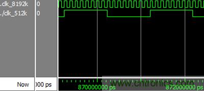 由圖3-2得知,當8192kHz的晶振時鐘輸入16個時鐘,系統輸出1個時鐘,即一個512kHz頻率的時鐘。程序設計中采用計數器來實現,當計數器值為0-((n/2)-1)=-7時,輸出時鐘信號進行翻轉,同時給計數器一個復位信號,使下一個時鐘上升沿到來時,計數器重新開始計數,不斷循環下去。