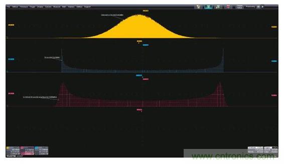 在許多應用中,兩個或多個隨機過程可能發生交互。當這種情況發生時,過程的概率密度會進行數學卷積運算。一個常見的例子是結合了隨機和確定性抖動分量的時序抖動。圖5顯示了結合在一起的高斯和正弦分量,源分布位于上面兩張圖,從上往下數的第三張分布圖是兩個源卷積的結果。許多先進的示波器提供可選的抖動或噪聲分析包,這些分析包可以將這些組合式分布分開,單獨測量分量。