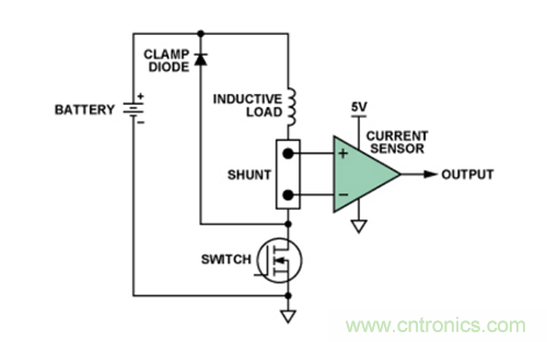 本例將詳細介紹一種典型的高端電流檢測應用。圖1所示為汽車應用環境中用于監控電磁閥或其它感性負載的常見配置。
