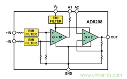 AD8208的更多詳情:AD8203(圖A)是一款單電源差動放大器,非常適合在大共模電壓情況下放大和低通濾波小差分電壓。采用+5 V單電源供電時,輸入共模電壓范圍為-2 V至+45 V。該款放大器提供增強的輸入過壓和ESD保護,并內置EMI濾波功能。