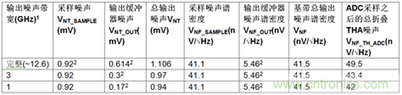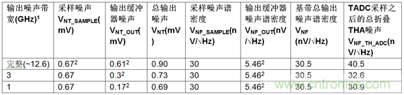 在采樣過程中,下游ADC將輸入帶寬(表1和表2中所示的濾波和ADC輸入帶寬的組合)上的所有THA噪聲外差到一個(gè)ADC奈奎斯特區(qū)間。因此,總折疊噪聲是ADC噪聲帶寬上的總THA輸出放大器時(shí)域噪聲的一部分。