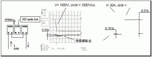 對階躍電流的超快速響應(yīng)時間對IGBT短路保護必不可少。HX系列可以以50A/ms以上的速度,準確追蹤電流變化,對階躍電流的響應(yīng)最快為3ms。