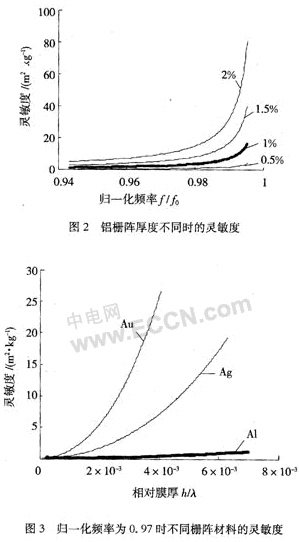 綜上分析,對于STW傳感器,柵陣厚度的增加有利于靈敏度的提高,柵陣厚度越大,靈敏度越高。但是在同一工作頻率下柵陣厚度的增加同時引起損耗的變化,在實際器件設計時,應當同時考慮這兩個因素,選擇一個最佳厚度。在柵陣厚度值確定時,IDT的激發頻率接近阻帶邊緣頻率時能獲得較大的靈敏度。對于柵陣材料的選擇,由以上的分析可知,金獲得靈敏度最大,大于銀的2倍,遠遠高于鋁。