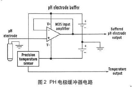 高阻抗PH傳感器可與具有低功率電路(僅需要2個1.5V電池供電)的放大器配對(圖2)。放大器MOS輸入晶體管為傳感器提供高阻抗,傳感器輸出阻抗為1MW或更大。此放大器的輸入偏置電流小于1pA,所以,放大器工作消耗非常小的電流。放大器的失調(diào)電壓小于1mV。放大器提供軌到軌工作并具有高驅(qū)動能力,能在長線上發(fā)送信號(放大器遠離ADC的情況)。在電路中增加了一個精密溫度傳感器,可以測量PH傳感器的溫度。這使得具有精確的PH溫度補償值。