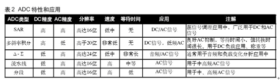 大多數(shù)信號調(diào)理應(yīng)用采用逐次逼近(SAR)或積分型ADC。這兩種ADC能很好地處理dc信號,而SAR型ADC對快速ac信號能提供更好的支持(表2)。SAR轉(zhuǎn)換器是所有ADC中最通用的,這種轉(zhuǎn)換器把高分辨率(高達16位)和高吞吐能力結(jié)合在一起。