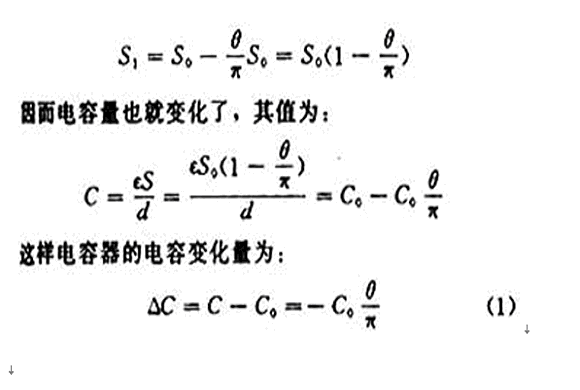 圖1是3種這類傳感器的原理圖,圖1(a)中是利用角位移來改變電容器極板遮蓋面積。假定當2塊極板完全遮蓋時的面積為S0,兩極板間的距離為d,極板間介質的介電常數為ε。當忽略邊緣效應時,該電容器的電容量為: