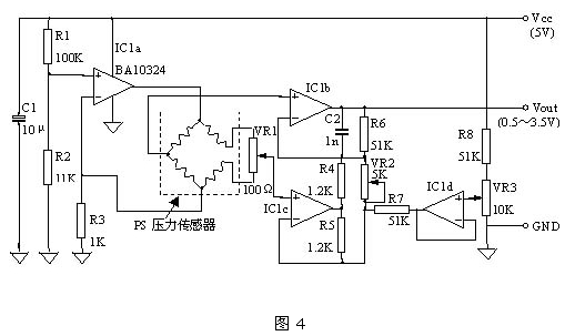 圖4是PS壓力傳感器的外圍電路設計實例,圖中用恒流源來驅動壓力傳感器。