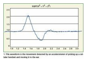 圖1:圖中波形是檢測拿起手機并送到耳邊這個動作的加速計所測到的姿態(tài)運動。