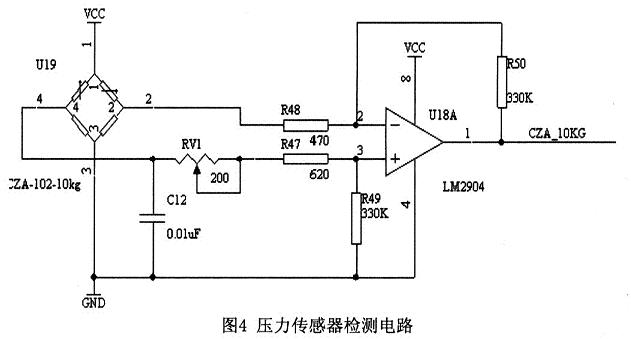 圖4為壓力傳感器的應用電路圖,該電路采用的電橋構成測量電壓,是一種具有較高靈敏度的測量方法。無差壓時,電橋兩臂平等。差壓信號加到4個陶瓷壓敏電阻上,壓敏電阻的阻值隨差壓而變化,引起電橋失衡。電橋失衡引起電流的變化,通過運放LM2904進行電流的放大在后面接ADC0834模數轉換芯片,把模擬信號轉化為數字信號,再傳輸至CPU進行處理。