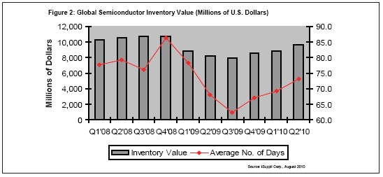 圖2所示為iSuppli公司對于2008年第一季度到2010年第二季度的半導體庫存價值的預測,分別以美元和庫存天數計量。