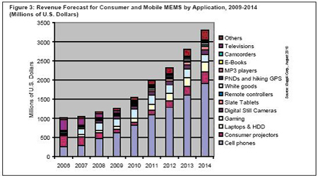 但是,消費(fèi)與移動MEMS預(yù)計到2014年將成為最大的MEMS領(lǐng)域,現(xiàn)在已是最大的MEMS市場之一。感測器已進(jìn)入日常設(shè)備之中,如筆記本電腦、MP3播放器、遙控器和便攜導(dǎo)航設(shè)備。