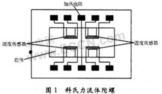 圖1是由清華大學設計、中國電子集團第13研究所加工而成的微流體陀螺儀。它是利用氣體流速方向在哥氏加速度作用下發生偏轉的原理,采用微機械加工工藝制作的。此微流體傳感器由隔熱腔體、加熱器和兩對對稱的溫度傳感器構成。加熱器和溫度傳感器懸在腔體上面。加熱器加熱使其周圍的氣體溫度升高,密度減小。在重力加速度的作用下,腔體內的氣體發生對流。位于加熱器相等距離上的一對溫度傳感器用來測量加熱器兩邊的溫差。