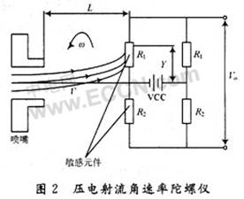 射流氣體陀螺是利用強迫對流氣體的氣流束(層流)和敏感元件的熱阻效應來測量角速率的。目前,采用MEMS技術制作的射流微陀螺并不多。報道的射流氣體微陀螺主要由壓電驅動泵、循環氣流通道及腔室、微噴嘴和熱敏元件等組成。它結構簡單,無活動檢測質量,抗過載能力強,成本低,壽命長。它是在哥氏力定理基礎上發明出來的,它通過壓電泵驅動氣體循環,當陀螺有角速度信號輸入時,利用哥氏力使循環氣流束偏轉來實現角參數的測量。循環氣流是由壓電泵激勵而產生的氣體層流束(射流),信號由兩根平行的熱敏絲R1,R2敏感。當輸入角速度為∞時,由于哥氏力的作用,射流束偏離原來所在的射腔的中心位置(見圖2),偏離的角度和方向決定于輸入角速度,這樣通過測量外圍電路電壓的變化便可測量出相應的加速度值。
