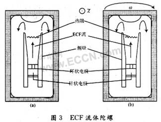 流體是一種新型的流體材料,當在流體兩端的電極上加上幾千伏的電壓時,ECF流體可以產生很強的流動,利用ECF流體的這種特性可以制作基于ECF的流體陀螺。由日本東京工業大學制作的這種流體陀螺如圖3所示,其基本原理如下:在容器內部充滿ECF液體,當在如圖3所示的電極上加上上千伏的電壓時,便會產生很強的ECF液體沖擊流,并往圖3(a)所示方向流動。