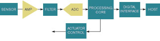傳感器的模擬信號必須經(jīng)過數(shù)字化才能供系統(tǒng)使用,并且信號要經(jīng)過放大、濾波和數(shù)字化(圖1)。每一級通常都涉及一只圍繞著一些無源元件的器件,以正確地實現(xiàn)一個應用。一旦對信號做了數(shù)字化,就可以將其送給微處理器上的控制系統(tǒng),或整理數(shù)據(jù)后通過一個通信協(xié)議送至一只主處理器。協(xié)議可以根據(jù)需要使用傳感器數(shù)據(jù)。