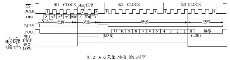 如圖 1ADS7843串行接口的一次完整操作需要 3× 8=24個 DCL K時鐘周期前 8個脈沖接收 8位的命令并在第 6個脈沖的上升沿開始 A / D轉換器進入采樣階段從第 9個脈沖開始進入轉換階段輸出12位采樣值轉換結束進入空閑階段直到 24DCL K結束CS置高電平一次測量結束如圖 2所示此外ADS7843還支持其他的工作方式這里不再詳述