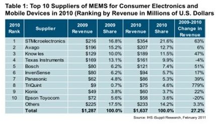 2010年TriQuint在該領域的營業收入劇增778.6%,達到7470萬美元,而2009年只有區區850萬美元。TriQuint在該市場的排名因而從2009年的第16竄升至第8。意法半導體在10大廠商中的增長率排名第二,其營業收入大增63.5%,從2009年的2.163億美元上升到3.536億美元,擴大了在全球消費與移動MEMS銷售額方面的領先優勢。