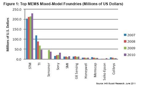 據(jù)IHS iSuppli研究,意法半導(dǎo)體(STM)在2010年仍然是最大的MEMS傳感器生產(chǎn)商,營(yíng)業(yè)收入幾乎是排名第二的德州儀器的五倍。
