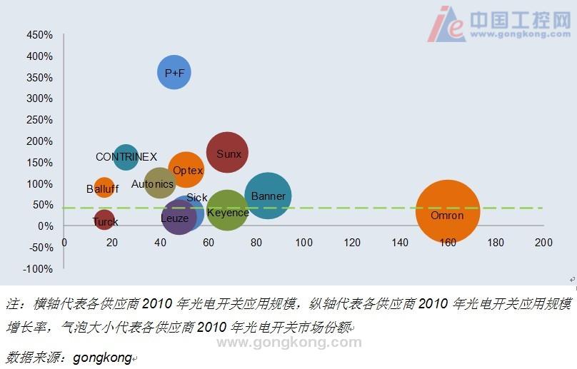 從廠商角度來(lái)看,各主流廠商表現(xiàn)的差異非常大。部分廠商,如Autonics、IFM光電開(kāi)關(guān)和接近開(kāi)關(guān)銷售業(yè)績(jī)的增長(zhǎng)幅度在100%以上,而還有部分廠商增長(zhǎng)只有10%左右。相比之下,編碼器的主流廠商業(yè)績(jī)?cè)鲩L(zhǎng)幅度雖然也有差距,但是差距相對(duì)較小,增長(zhǎng)幅度最大的為60%,增長(zhǎng)幅度最小的低于10%。但這些變化未改變傳感器市場(chǎng)的整體格局,Omron以全面的產(chǎn)品系列和普遍的實(shí)用性立足于大眾化市場(chǎng),市場(chǎng)份額仍遙遙領(lǐng)先于其他企業(yè)。歐美系品牌中,Turck、Sick和Banner定位于高端市場(chǎng),以先進(jìn)的技術(shù)和穩(wěn)定的質(zhì)量贏得冶金、汽車、物流等高端客戶的青睞。