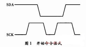 (1)傳輸開始。在SCK為高時使SDA由高電平變為低電平,并在下一個SCK為高時將SDA升高,如圖1所示。