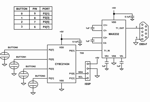 為了實現電容式傳感和串行通信,該電路采用了賽普拉斯的CY8C21x34系列中的PSoC IC芯片。該芯片包含一組模擬和數字功能塊,這些功能塊可由存儲于板上閃存中的固件來配置。另一顆芯片負責處理RS232的電平移位,以便建立到主機的通信鏈接,并實現波特率為115,200的電容式傳感數據記錄。四個電容傳感按鍵的引腳分配在圖5的表中給出。PSoC是通過一個包含電源、地以及編程引腳SCL和SDA的ISSP接頭來實現編程的。而通過一個DB9連接器將電腦與電容式傳感電路板相連。