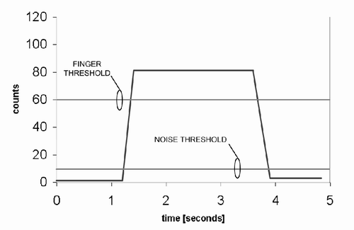 噪聲門限被設定的計數值為10,而手指門限設定的計數值則為60。實際上,在實際計數數據中噪聲分量是始終存在,圖中沒有顯示是為了能清晰地顯示門限水平。