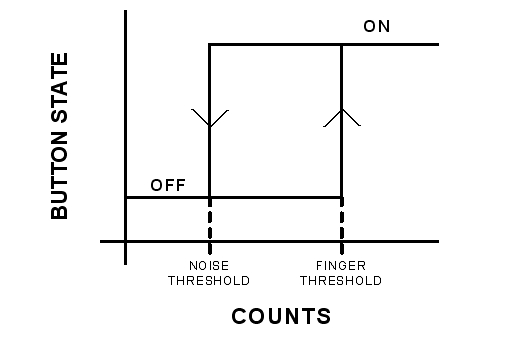 該轉移函數中的延滯帶來了開關狀態之間的快速轉換,即使計數是有噪聲的情況下也不例外。同時這還給按鍵帶來了一種反跳功能。低門限被稱為“噪聲門限”,而高門限則被稱為“手指門限”。門限水平的設定決定了系統的性能。當覆蓋層非常厚時,信噪比很低。在此類系統中設定門限水平是一項具有挑戰性的工作,而這恰好是電容式傳感設計技巧的一部分。