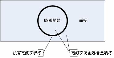 e.如果必須電鍍或高金屬含量漆,請在按鍵區域的邊緣保留一圈不要電鍍或噴漆,用以隔絕其他感應開關。