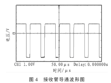 發射管選取SIR204-A型發射管,該紅外線二極管驅動電流范嗣為20~100 mA,其正向導通壓降為1.3~1.5 V,發出紅外線光波長范圍約為835~930 nm,發射角度為30°,直射時紅外線光強度最大。發射管驅動電壓采用脈沖電壓,38 kHz載波頻率,發送時長為280 μs,占空比為1/2的方波,發送間隔為720 μs。載波脈沖需要與紅外線接收管的型號相匹配。紅外發射管能夠匹配光電晶體管、光敏二極管和紅外接收器模塊,紅外傳感器的接收部分選擇了帶有放大和濾波功能的紅外線接收二極管。發射部分的設計需要考慮到接收部分的制約。經過驗證調制脈沖驅動電流能夠匹配紅外線接收管,將紅外線接收管導通。驅動發射管PWM的波形如圖1所示。