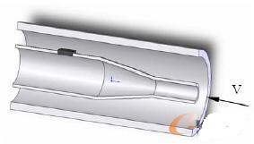 作者所在的研究組在前期應用壓力梯度法和壓力互相關法測量液壓系統(tǒng)流量進行了理論和實驗研究,取得了一定進展,在此基礎上,提出這種不需要引壓,直接讓 MEMS敏感芯體在管內(nèi)獲得與流量對應的差壓信號的新方法。相比之下新方法在對系統(tǒng)較低擾動的前提下更易獲得較高的信號水平,精度能滿足一般液壓系統(tǒng),具有高的動態(tài)測量頻寬。其機理是利用內(nèi)置于管道中特殊設計的異徑結構裝置,如圖1所示,對內(nèi)外流體分別產(chǎn)生收縮和擴壓雙效作用,獲得低壓損、低能耗的微小壓力差,通過置于上面的MEMS敏感芯體測取,并根據(jù)建立的壓差-流量關系模型,及仿真手段和實驗測試得出該狀態(tài)下的流量值。