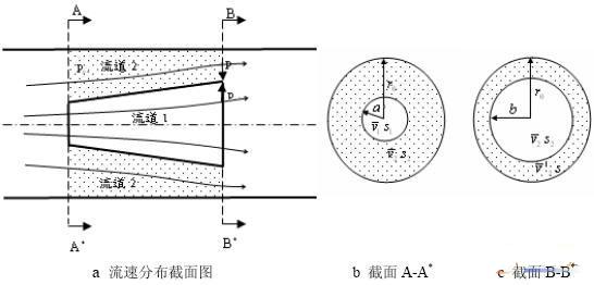 如圖2所示,流體在異徑管內(nèi)外被分為流道1和流道2,在這里,r0為管路半徑,a、b分別為內(nèi)流道入口和出口處半徑,忽略異徑管厚度,因此a、b也是外流道的進出口處內(nèi)徑,假設從截面A-A*到截面B-B*流線不發(fā)生增加或者減少,即任何A-A*面上一微元ds都可以沿著流線找到在B-B*面上的映射 ds*,則在流道1內(nèi)任一流線上有: