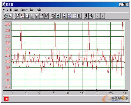 在動態(tài)試驗中,保持液壓泵提供20L/min的工作流量,使用Wavebook512信號系統(tǒng)對MEMS傳感器輸出流量信號進行采集,如圖7所示。盡管受到系統(tǒng)內(nèi)閥口、管路等造成的干擾,而且由于柱塞泵各柱塞在制造、安裝以及使用中產(chǎn)生的誤差和磨損造成的不均勻現(xiàn)象,導致流量波動曲線有些變形,但是還是可以很清晰的看出流量的波動周期約為60ms,即頻率16.7Hz。由于電動機工作在50Hz頻率,額定轉速1000r/min,因此相應的軸向柱塞泵運轉頻率也是1000/60=16.7Hz,這正與上面的測量結果吻合。