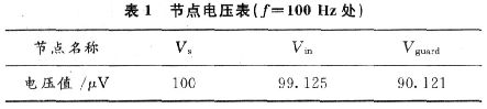 對圖2所示的電路,用PSpice仿真軟件對電路進(jìn)行模擬分析,交流掃描的結(jié)果如下,各關(guān)鍵節(jié)點電壓如表1所示,電阻R1的低阻抗端加上了90.121μV的保護(hù)電壓,流經(jīng)電阻R1的分流電流為90.031 fA。