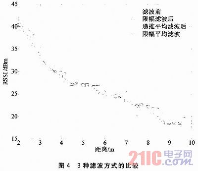 紅外線、GPS和超聲測距都需要額外的硬件,增加了節點的硬件成本和尺寸。GPS和紅外線測距誤差較大,而利用超聲方法測距很精確,測距誤差只有10 cm,但是受氣溫、濕度等的影響較大,不適合在室外使用。基于RSSI的定位無需額外硬件,利用對接收無線信號的強度判斷,推導收發節點間的距離,計算接收無線信號強度是商用無線收發芯片具備的功能。基于RSSI的測距提供了最廉價的定位方法,而且節點沒有添加任何部件?;诔暤臏y距雖然定位精度較高,但是需要添加硬件、增加節點成本和尺寸。所以,基于RSSI的測距是無線傳感器網絡定位較常采用的方法。首先對RSSI進行預處理,再通過預測模型預測距離的值,不但提高了基于RSSI的測距精度,而且實現了低成本的測距。