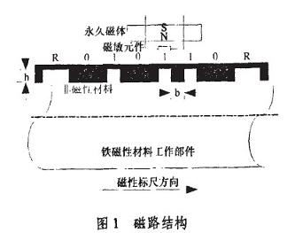 采用圖1所示的測量結(jié)構(gòu),其中被測工作部件要求屬于鐵磁性材料。文獻中指出在固定的磁場中,表面變化的曲率越大,引起的周圍磁場,變化也越大。為了使磁場的影響最大,選用凹槽作為測罩標(biāo)志,以單位寬度(bmm)的凹槽表示“0”或碼元間隔,單能寬度的“凸槽”表示“1”,兩倍單位寬度的“凸槽”表示標(biāo)志位R。在工作部件表面,按上述的編碼規(guī)則加下出一系列凹槽,然后噴涂上非磁性材料,形成磁性標(biāo)尺。圖1所示的磁性標(biāo)尺表示Gray碼01 1010碼區(qū),黑色部分表示非磁性材料。