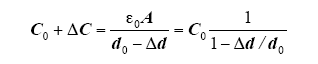 為提高傳感器的靈敏度K,提高精度、減小非線性誤差&,電容傳感器大都采用差動式結構。在差分電容傳感器中,當動極板的移動距離為Dd時,電容C1的間隙d1變為d0-Dd,電容C2的間隙d2變為d0+Dd。